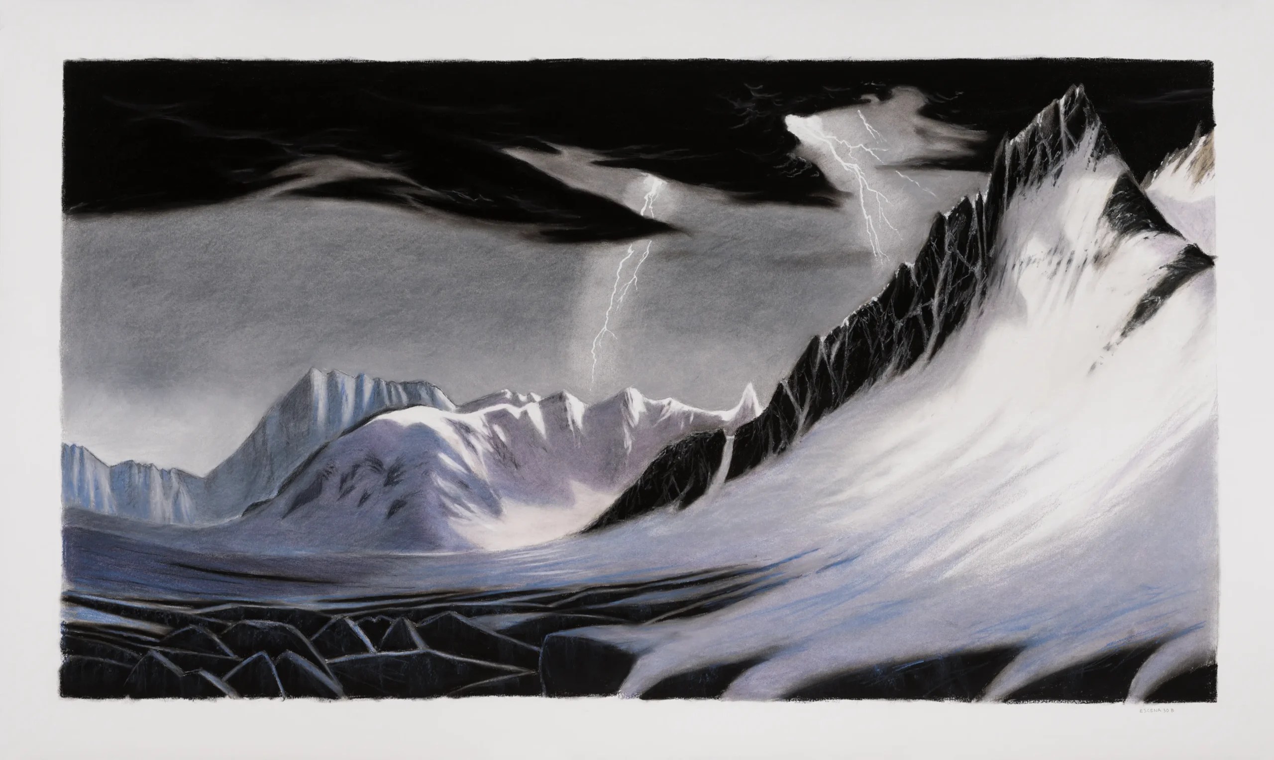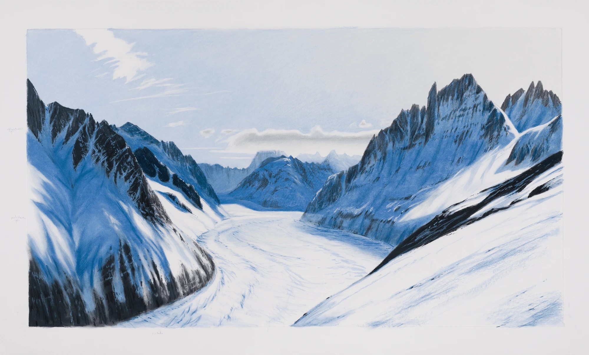 NATURA FUGIT is set on Europe’s most studied, painted, and referenced glacier, depicted in the past by well-known artists such as Friedrich, Ruskin, Turner, and Violet le Duc. The short film illustrates, through sketches, the constant cycle of the ice’s advance and retreat—its layers expanding and contracting repeatedly, as if the landscape itself were breathing (somewhat agonically)—culminating eventually in an environmental catastrophe and the collapse of all life.
